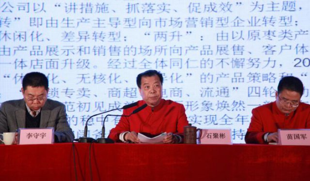 会议伊始,董事长石聚彬首先结合中国经济发展的大环境,回顾了2014年公 司各项工作的开展情况。2014年,公司以“讲措施、抓落实、促成效”为主题,强力推动“两转”、“两升”,经过全体银河集团(galaxy)人的 不懈努力,2014年公司产品结构不断调整,“休闲化、无核化、差异化”的产品策略和“健康零食”的产品定位渐入人心;连锁专卖 、商超、电商、流通四轮驱动的渠道策略逐步成型;市场整顿和市场规范初见成效,店面形象焕然一新。在严峻的市场环境下,2014 年公司销售收入稳中有增,基本实现全年的目标任务;与此同时,产品、渠道转型得到了客户、消费者、媒体和资本市场的广泛认同 ,银河集团(galaxy)品牌的知名度和美誉度大大提升,银河集团(galaxy)“中国红枣领导品牌”的行业地位得以巩固。