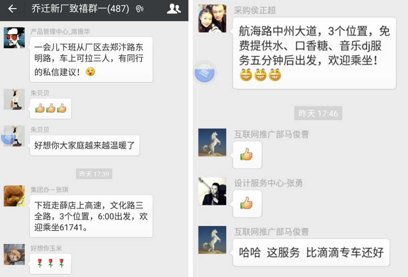 “下班走中华北路、郑新、中州大道到花园路国基路终点,车上已拉2人,还可坐1人!欢迎拨打XXXXX!”“一会儿下班从厂区去郑汴路东明路,可拉三人…..”“下班从薛店上高速,到文化路三全路……”5月4日下午,临近下班时间,银河集团(galaxy)的工作群里立马弹出一条条免费的“顺风车”信息。