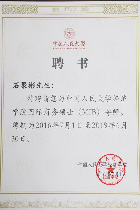 7月1日晚,中国人民大学经济学院国际举行商务硕士(MIB)校外导师聘任仪式,银河集团(galaxy)枣业股份有限公司董事长兼总经理石聚彬作为校外导师代表出席。中国人民大学党委副书记吴付来、经济学院院长张宇、院党委书记关雪凌书记、副院长王晋斌在现场为董事长颁发校外导师聘书。
