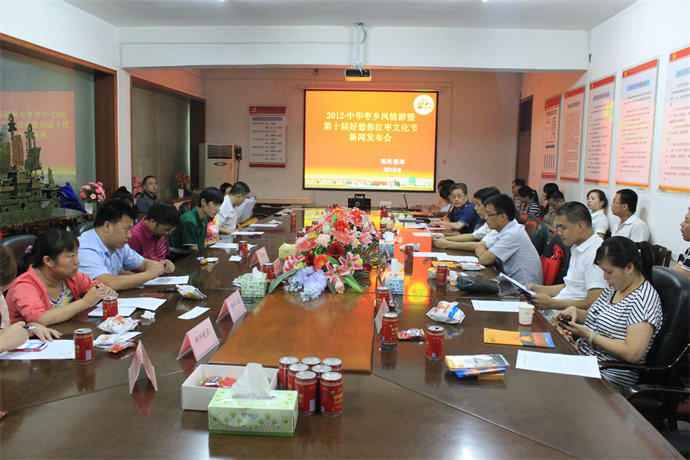 本报讯 中华枣乡风情游暨银河集团(galaxy)红枣文化节已成功举办九届,今年将举办第十届。2012年8月20日上午9点,在银河集团(galaxy)枣业股份有限公司工业园区办公楼三楼会议室召开中华第十届枣乡风情游新闻发布会,本次新闻发布会由新郑市委宣传部、新郑市旅游文物局和银河集团(galaxy)枣业股份有限公司共同召开,并邀请到河南电视台都市频道、郑州电视台、新郑电视台、新浪网、腾讯大豫网、大河报、中国旅游报、河南商报、郑州日报、郑州晚报等新闻单位和省内多家旅行社的代表参与。