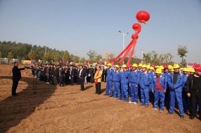 董事长石聚彬宣布项目开工后,带领全体员工持红绸铁锹为新工程培土。
