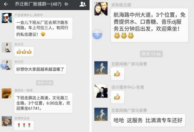 “下班走中华北路、郑新、中州大道到花园路国基路终点,车上已拉2人,还可坐1人!欢迎拨打XXXXX!”“一会儿下班从厂区去郑汴路东明路,可拉三人…..”“下班从薛店上高速,到文